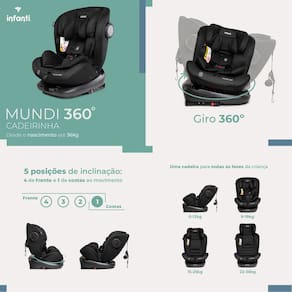 Uma volta ao mundo em 360? Pelo tempo de uso que a cadeirinha para auto Mundi 360, da Infanti te proporcionará, sim, com certeza! Uma cadeirinha para uso do nascimento até os 36 kg do seu filho. Com fácil instalação, a cadeirinha será utilizada no sistema ISOFIX e Top Tether do seu veículo, assim, em poucos minutos, já é possível sair com a sua Mundi, perfeitamente instalada, para voltas e mais voltas por aí, com toda a tranquilidade.