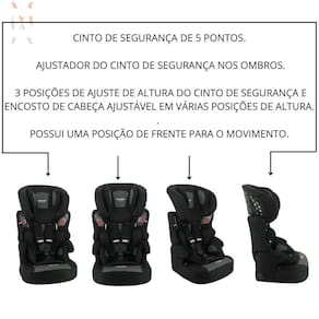 Tecnologia, design e funcionalidade aliados em um único produto.Cadeira para Automóvel Team Tex Nania Kalle Riche Grafik, certificada para o Grupo 1/2/3 de 9 kg a 36 kg , fabricada na França pelo maior produtor Europeu de dispositivos de retenção infantil. Possui travesseiro, ombreiras, almofada redutora de costas e assento, protetor entre-pernas, capa protetora da fivela.Além disso, conta com cinto de segurança de 5 pontos, ajustador do cinto de segurança nos ombros, 3 posições de ajuste de altura do cinto de segurança e encosto de cabeça ajustável em várias posições de altura. Possui uma posição de frente para o movimento.Características geraisNo grupo 1 de 9kg a 18kg deve ser fixada ao veículo com o cinto de segurança do veículo e a criança deve utilizar o cinto de segurança da própria cadeirinha. No Grupo 2 e 3 de 15 a 36kg deve ser utilizada sem os seus cintos de segurança e o cinto de segurança do veículo deve prender a criança e a cadeirinha ao mesmo tempo. Tecido auto extinguível não propaga o fogo . Certificado pelo INMETRO - SimLavável - simCinto de segurança ajustável - simNúmero de posições de regulagem - 1Peso suportado kg 9 a 36kgMaterialpolipropileno/poliestireno/100% POLIÉSTERIdade recomendada01 a 10 anosCorpretaConteúdo da embalagem1- Cadeira para Automóvel Team Tex Nania Kalle Riche Grafik - 9 a 36kg - PretoGarantia12 mesesObservações - Nota: Apropriada se o veículo estiver equipado com cinto de segurança subabdominal, três pontos, estático, com retrator. Nunca deve ser instalada com um cinto abdominal de 2 pontos. Certificada pelo INMETRO.