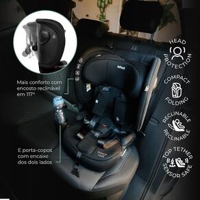 Características Indicação: Para crianças de 9 a 36 kg. Instalação: Fácil e segura com o sistema Isofix e Top Tether. Sinal Sonoro: Indica fixação correta do Top Tether. Estrutura Europeia i-Size: Maior estabilidade e segurança em caso de impacto. Proteção Avançada: Head Protection para a cabeça e Side Protection para impactos laterais. Encosto Reclinável: Até 117 para acompanhar o crescimento da criança com conforto ergonômico. Porta-Copos: Lateral, encaixa nos dois lados. Compact Folding: Fácil de dobrar e guardar quando não está em uso.