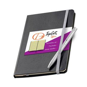 Capa dura, bolso interno, fecho elástico e fita marcador.
