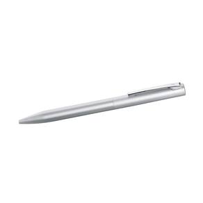 Possui caneta em alumínio com clipe de ferro e escrita azul.