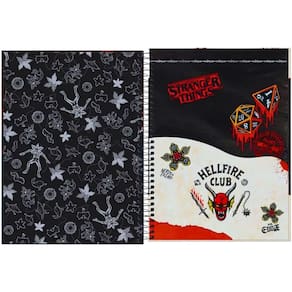 Capa dura com detalhes metalizados e parte interna decorada Bolsa de papel decorada Espiral colorido Folha de adesivos funcionais 16 matéria 256 folhas Formato: 200 mm x 275 mm Gramatura: 56 g/m² Perfeito para estudantes que desejam unir tecnologia, qualidade e um visual exclusivo inspirado no universo de Stranger Things.