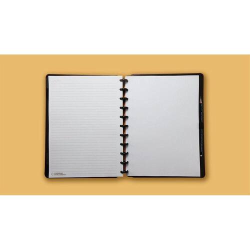 Caderno Basic Black Médio Cimd3090 Caderno InteligenteO caderno que você tira e coloca folhas quando quiserCaderno inteligente, só Caderno InteligenteCapa e contracapa rígidas01 bolsa plástica01 folha de instrução de uso e manuseio, com refis e acessórios da marca disponíveis no verso01 folha de identificação com calendário no verso04 divisórias com abas para identificação 02 pretas e 02 transparentes .80 folhas offset 90g 60 folhas pautadas e 20 folhas lisas brancas para impressão .01 suporte com elástico para 01 caneta ou 01 lápis e discos M + elástico.Tamanho: Médio é exatamente o que seu nome promete um intermediário entre o A5 e o universitário.Com ele, você pode escrever muito sem sentir tanto o peso a mais de carregar um caderno maior, então é perfeito para aqueles estudantes que preferem não sair de mochila todos os dias ou precisam levar muitos livros ou apostilas para lá e para cá.Também é excelente para reuniões de trabalhoDimensões produto Médio : 25,5x19 centímetros.