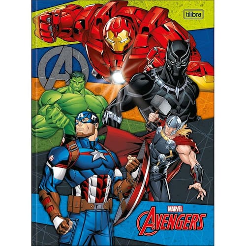 O Caderno Brochura Capa Dura Universitário Avengers 48 Folhas possui capa dura com a parte interna decorada, folha dupla de adesivos e folhas pautadas. Ideal para o dia a dia na escola.