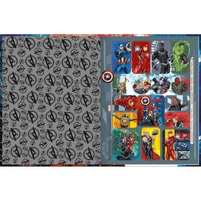 O Caderno Brochura Capa Dura Universitário Avengers 48 Folhas possui capa dura com a parte interna decorada, folha dupla de adesivos e folhas pautadas.