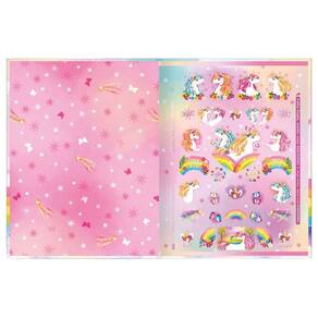 Este modelo de caderno brochura tem capa dura com glitter e parte interna decorada, folha dupla de adesivos e folhas pautadas.