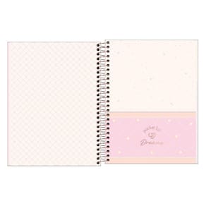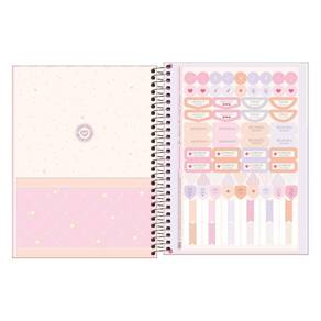 Use este modelo, com capa dura com detalhes metalizados e parte interna decorada, espiral colorido, bolsa de papel decorada para guardar trabalhos, adesivos funcionais, folhas pautadas, decoradas e destacáveis, para anotar as aulas, fazer resumos, listar tarefas e organizar as ideias de forma prática e eficiente.