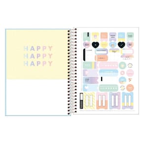 - Caderno espiral com 160 folhas - Capa plástica com detalhes metalizados - Cor da capa: azul - Miolo pautado - Bolsa de papel decorada - Folha de adesivos - Formato: 17,7x24 cm Ean: 7891027307035