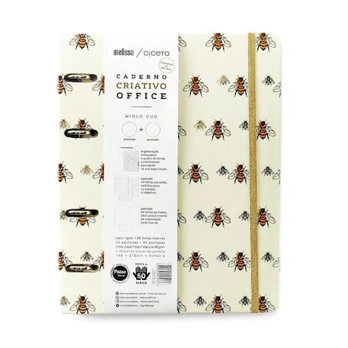 Características: - marca: cícero papelaria - modelo: melissa favo de abelhas - medidas aproximadas das folhas de miolo: 14,8 x 21cm - capa rígida - argolas estilo fichário - 4 divisórias com abas customizáveis. Únicas da parceria - 40 folhas pautadas e 40 folhas pontadas em papel pólen natural - bolsa pasta - diversas possibilidades de refil com outros miolos vendidos separadamente