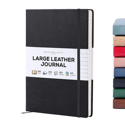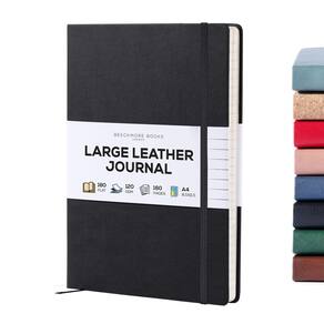 BEECHMORE BOOKS Caderno de diário forrado, 21,5 x 29 cm, A4 160 páginas forradas, diários de couro de capa dura para mulheres, homens, anotações e cadernos para trabalho - papel grosso de 120 g/m², - Tamanho espaçoso para grandes ideias – Perfeito para trabalho, diário ou projetos criativos, nossas páginas perfuradas de couro sem ácido oferecem muito espaço para capturar seus pensamentos sem se sentir constrangido. - Aproveite a escrita sem derramamento – Este caderno profissional de capa dura usa páginas grossas que resistem a sangramento de tinta para usuários de caneta-tinteiro. Cada palavra permanece intocada e legível, não importa a sua escolha de caneta! - Faça uma declaração elegante – com folhas de creme marfim, este caderno A4 pautado pela faculdade exala sofisticação. Projetado no Reino Unido, este caderno para escritores é perfeito para profissionais e criativos. - Feito para sua conveniência – a encadernação plana de 180° do diário pautado largo A4, fecho elástico, bolso traseiro profundo e fita de marcador de página oferecem praticidade moderna e uma experiência premium. - Encante seus entes queridos – Ideal para negócios e uso pessoal, este caderno A4 de capa dura vem lindamente embalado em uma caixa de presente, tornando-o um presente memorável para qualquer ocasião.