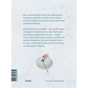 Este Caderno de férias não é um caderno para completar só durante as férias. É um caderno para que as férias aconteçam quando quisermos que elas aconteçam. Em uma série de atividades — que vão de soprar um sapato a transportar uma ilha deserta para um cômodo qualquer da sua casa —, Grassa Toro e Isidro Ferrer levam crianças e adultos, até aqueles rabugentos, por uma travessia náutica em que a única regra é usar o que temos dentro da cabeça para imaginar. Marca: BAIAO EDITORA