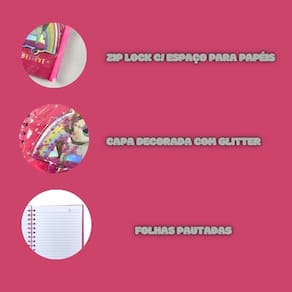 A Caderneta Decorada Unicórnio é cheia de estilo. Possui um bolso para guardar papéis, capa dura, espiral colorida e folhas pautadas brancas.