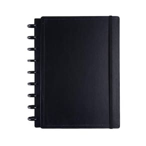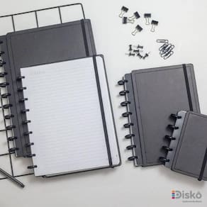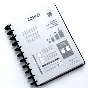 Caderno Disko Black M 190x255mm 80fls DK22C219 Conheça o caderno Diskô, um caderno prático e personalizável que se adapta às suas necessidades, possibilitando adicionar, remover e reorganizar as folhas como quiser. Possui um sistema de encadernação inovador, que usa discos para prender as folhas do seu caderno.