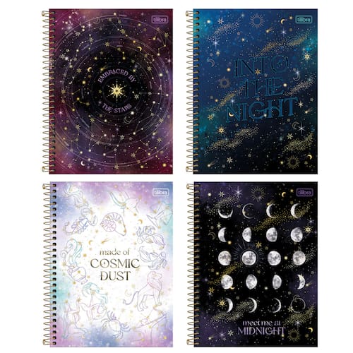 Possui 160 folhas divididas em 10 matérias, capa dura com detalhe metalizado, parte interna decorada, bolsa de papel decorada, folha com adesivos funcionais e folhas pautadas destacáveis.