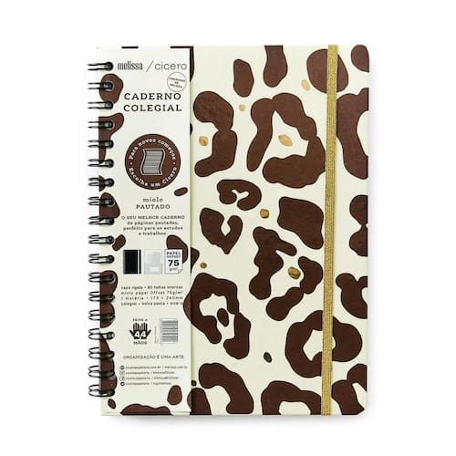 O Caderno Espiral Melissa Pautado 17x24 Onça é perfeito para estudos, trabalhos e ideias.