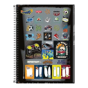 Capa: dura Espiral: Colorido Folha de adesivos Folhas: pautadas Índice/separador de matérias: decorados Material: Capa Dura Miolo Número de matérias: 10 matérias Parte interna da capa decorada Produto certificado: FSC Formato: 200mm x 275mm Gramatura: 56 g/m² Número de folhas: 160 folhas