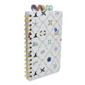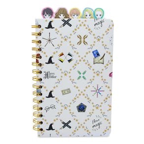 JOT DOWN ALL THOSE MAGICAL MUSINGS Take note of the Wizarding World with this exclusive spiral notebook inspired by Harry Potter. This journal's creamy backdrop features a pattern of stars and feathers across the front and back covers. Look closely to see a wide array of imagery from the magical adventures of The Boy Who Lived — Sorting Hats, spellbooks, and Golden Snitches abound. You'll also find Harry, Ron, Hermione, Luna, and Draco as a set of chibi tabs to divide up your notes. MAKE YOUR MEMORIES EVEN MORE MAGICAL Different subjects call for different solutions. One size does not fit all, especially when magic is involved. This journal provides the perfect space for writing down important notes, doodling in class (even when you should be paying attention), and marking down those precious spells you've been practicing. It's time for your story to properly begin with this officially licensed notebook inspired by the Wizarding World of Harry Potter. - GET BACK TO HOGWARTS: It's time to return to the magic of the Wizarding World. Prepare to tell your own epic tale with this exclusive spiral bound notebook that's all about your story, with the help of friends and foes from Harry Potter. - FEATURES ESTEEMED ALUMNI: Apparate your favorite characters with this enchanted journal. While the cover is filled with magical icons, you'll also find chibi tabs of Harry Potter, Hermione Granger, Luna Lovegood, Draco Malfoy, and Ron Weasley. - ALL YOUR SPELLS IN ONE PLACE: Plenty of space for notes and sketches with 75 pages of lined and graph paper, including 5 tabbed sections. The perfect size for carrying in your bookbag or purse at approximately 8 x 5 inches. - STAY MAGICALLY ORGANIZED: You'll never forget the location of another secret passage or miss a memo from the Headmaster with this journal in hand. Use it for a taking notes, studying, travel diary writing, creating Horcruxes, and more. - OFFICIAL HARRY POTTER COLLECTIBLE: Whose life couldn't use a little more magic? With this officially licensed spiral notebook from Harry Potter, you'll be able to write your magical tale set at Hogwarts School of Witchcraft and Wizardry.