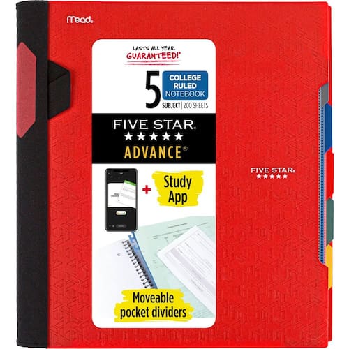 Five Star Caderno espiral + aplicativo de estudo, 5 assuntos, papel pautado universitário, caderno avançado com proteção espiral, divisórias móveis com abas e bolsos expansíveis, 21 x 28 cm, 200 - Dura o ano todo. GARANTIDO! - Digitalize, estude e organize suas anotações com o aplicativo Five Star App. Crie flashcards instantâneos e sincronize suas anotações com o Google Drive para acessá-las em qualquer lugar a partir de qualquer dispositivo. - Reorganize as divisórias de plástico móveis em qualquer lugar do seu caderno para organizar anotações. As divisórias com bolsos expansíveis suportam apostilas de 21 cm x 28 cm. As abas visíveis da capa frontal facilitam virar para qualquer seção. - O caderno de 5 matérias tem 200 folhas de papel de alta qualidade pautadas para faculdade dupla face que são perfuradas para facilitar a remoção. As folhas medem 21 cm x 28 cm quando rasgadas. - O protetor espiral cobre o fio para ajudar a evitar arranhões em roupas e mochilas. Etiquete seu caderno na lombada gravável e mantenha sua caneta ou lápis favorito à mão no laço da caneta. Disponível em vermelho fogo.