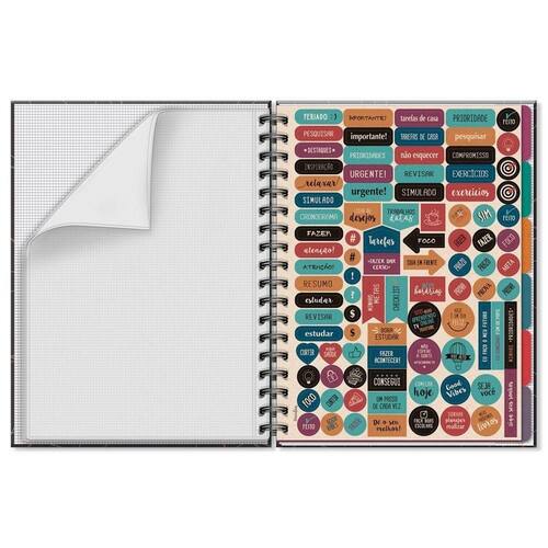Caderno Folhas Removíveis Geométrico Fina Ideia: - Caderno capa dura com estampa exclusiva e frase em hot stamp dourado; - Formato 16,5x23,2cm; - Miolo pautado com 80 folhas removíveis em papel offset 90g/m; - 6 divisórias removíveis coloridas e estampadas em papel Kraft 200g/m; - Encadernação wire-o e elástico para fechamento; - Acompanha envelope para documentos resistente e folha de adesivos.