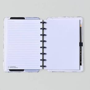 A5: Capa e contracapa rígidas, 01 bolsa plástica, 01 folha de instrução de uso e manuseio, com refis e acessórios da marca disponíveis no verso, 01 folha de identificação com calendário no verso, 04 divisórias com abas para identificação (02 pretas e 02 transparentes), 80 folhas offset 90g (60 folhas pautadas e 20 folhas lisas brancas para impressão), 01 suporte com elástico para 01 caneta ou 01 lápis e discos M + elástico. Medidas aproximadas do produto - Comprimento: 21 cm - Altura: 7 cm - Largura: 27 cm - Peso: 700 g