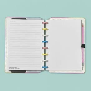 A5: Capa e contracapa rígidas, 01 bolsa plástica, 01 folha de instrução de uso e manuseio, com refis e acessórios da marca disponíveis no verso, 01 folha de identificação com calendário no verso, 04 divisórias com abas para identificação 02 pretas e 02 transparentes , 80 folhas offset 90g 60 folhas pautadas e 20 folhas lisas brancas para impressão , 01 suporte com elástico para 01 caneta ou 01 lápis e discos M + elástico. Ean: 7895099704983