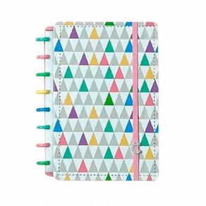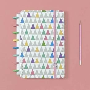 A5: Capa e contracapa rígidas, 01 bolsa plástica, 01 folha de instrução de uso e manuseio, com refis e acessórios da marca disponíveis no verso, 01 folha de identificação com calendário no verso, 04 divisórias com abas para identificação (02 pretas e 02 transparentes), 80 folhas offset 90g (60 folhas pautadas e 20 folhas lisas brancas para impressão), 01 suporte com elástico para 01 caneta ou 01 lápis e discos M + elástico.