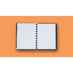 Capa e contracapa rígidas, 01 bolsa plástica, 01 folha de instrução de uso e manuseio, com refis e acessórios da marca disponíveis no verso, 01 folha de identificação com calendário no verso, 04 divisórias com abas para identificação (02 pretas e 02 transparentes), 80 folhas offset 90g (60 folhas pautadas e 20 folhas lisas brancas para impressão), 01 suporte com elástico para 01 caneta ou 01 lápis e discos M + elástico.