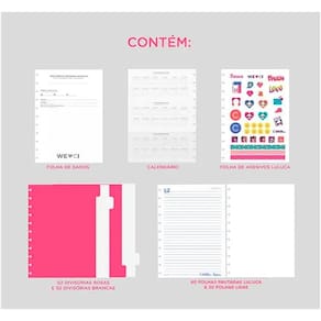 Com 1 bolsa plástica, você pode guardar documentos importantes de forma segura e prática. Já a folha de adesivos facilita a identificação de cada seção do caderno. A folha de instrução auxilia na montagem e personalização do seu caderno, enquanto a folha de identificação e calendário permite que você organize suas tarefas de forma eficiente.