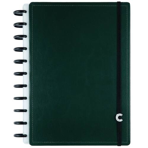 O que vem no produto: capa e contracapa rígidas na cor Dark Green com sistema de 11 discos G; 140 folhas offset 90g/m² (120 pautadas e 20 lisas); 10 divisórias com abas e página de índice; 1 folha de adesivos e 1 bolsa plástica; folha de identificação com calendário no verso; folha de instruções e dicas de acessórios; suporte elástico para 1 caneta ou lápis.
