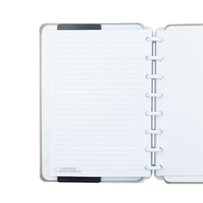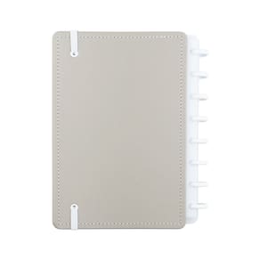 -A5, Médio ou Grande: Capa e contracapa rígidas, 01 folha de adesivos, 01 bolsa plástica, 01 folha de instrução de uso e manuseio, com refis e acessórios da marca disponíveis no verso, 01 folha de identificação com calendário no verso, 04 divisórias com abas para identificação, 80 folhas offset 90g (60 folhas pautadas e 20 folhas lisas brancas para impressão), 01 suporte com elástico para 01 caneta ou 01 lápis e discos M + elástico.