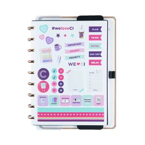 - Capa e contracapa rígidas; - 01 folha de adesivos; - 01 bolsa plástica; - 01 folha de instrução de uso e manuseio, com refis e acessórios da marca disponíveis no verso; - 01 folha de identificação com calendário no verso; - 04 divisórias com abas para identificação (02 pretas e 02 transparentes); - 80 folhas offset 90g (60 folhas pautadas e 20 folhas lisas brancas para impressão); - 01 suporte com elástico para 01 caneta ou 01 lápis e discos M + elástico; - Tamanho Médio (19x25cm).