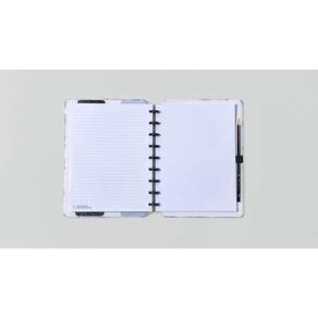 O caderno que você tira e coloca folhas quando quiser ;) No Caderno Médio contém: 80 folhas 90g (60 folhas pautadas e 20 folhas lisas brancas) Capa e contracapa rígidas01 bolsa plástica 01 folha de instrução de uso e manuseio 01 folha de identificação com calendário no verso 04 divisórias com abas (02 pretas e 02 transparentes) 01 suporte com elástico para 01 caneta ou 01 lápis e discos M + elástico. Medidas aproximadas do produto - Comprimento: 25,5 cm - Altura: 2 cm - Largura: 20 cm - Peso: 630 g
