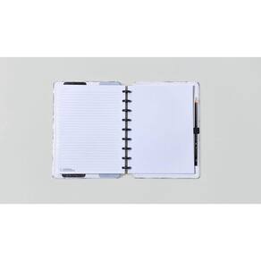 O caderno que você tira e coloca folhas quando quiser ; No Caderno Médio contém: 80 folhas 90g 60 folhas pautadas e 20 folhas lisas brancas Capa e contracapa rígidas01 bolsa plástica01 folha de instrução de uso e manuseio01 folha de identificação com calendário no verso04 divisórias com abas 02 pretas e 02 transparentes 01 suporte com elástico para 01 caneta ou 01 lápis e discos M + elástico.Medidas aproximadas do produto- Comprimento: 25,5 cm- Altura: 2 cm- Largura: 20 cm- Peso: 630 g