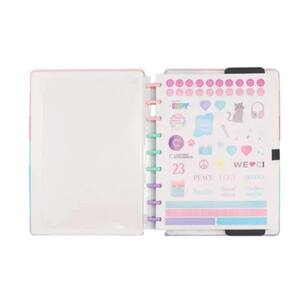 Capa e contracapa rígidas, 1 folha de adesivos, 1 bolsa plástica, 1 folha de instrução de uso e manuseio, com refis e acessórios da marca disponíveis no verso, 1 folha de identificação com calendário no verso, 4 divisórias com abas para identificação 2 pretas e 2 transparentes , 80 folhas offset 90g 60 folhas pautadas e 20 folhas lisas para impressão e 1 suporte com elástico para 1 caneta ou 1 lápis.