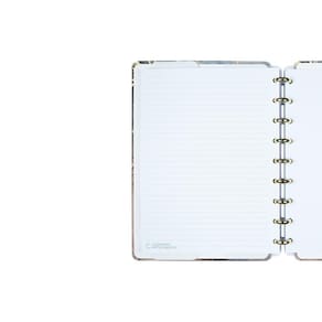O modelo possui capa e contracapa rígidas, com impressão em alta qualidade e aplicação de verniz localizado na capa, discos metalizados na cor dourado com o centro transparente e elástico para fechamento na cor marrom com nosso característico C.