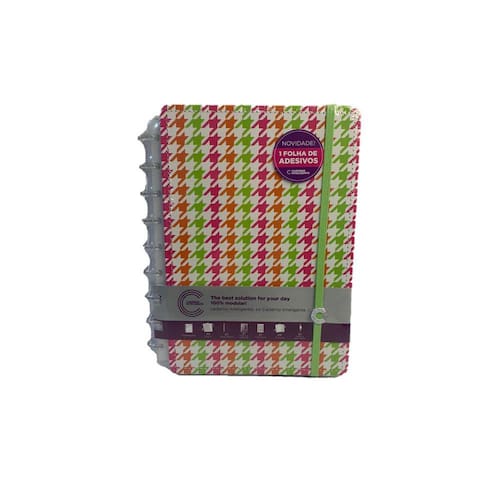 A5, Médio ou Grande: Capa e contracapa rígidas, 01 bolsa plástica, 01 folha de instrução de uso e manuseio, com refis e acessórios da marca disponíveis no verso, 01 folha de identificação com calendário no verso, 04 divisórias com abas para identificação 02 pretas e 02 transparentes , 80 folhas offset 90g 60 folhas pautadas e 20 folhas lisas brancas para impressão , 01 suporte com elástico para 01 caneta ou 01 lápis e discos M + elástico. Ean: 7895099702675