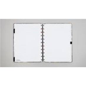capa e contracapa rígidas, 01 folha de adesivos, 01 bolsa plástica, 01 folha de instrução de uso e manuseio, com refis e acessórios da marca disponíveis no verso, 01 folha de identificação com calendário no verso, 04 divisórias com abas para identificação 02 pretas e 02 transparentes , 80 folhas offset 90g 60 folhas pautadas e 20 folhas lisas brancas para impressão , 01 suporte com elástico para 01 caneta ou 01 lápis e discos m + elástico.