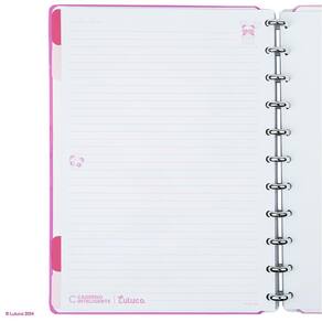 Características: - capa e contracapa rígidas, - 01 folha de adesivos, - 01 bolsa plástica, - 01 folha de instrução de uso e manuseio, com informações de refis e acessórios da marca disponíveis no verso, - 01 folha de identificação com calendário no verso, - 04 divisórias com abas para identificação 02 rosa choque e 02 rosa claro , - 80 folhas offset 90g 60 folhas pautadas e 20 folhas lisas brancas para impressão - 01 suporte com elástico para 01 caneta ou 01 lápis.