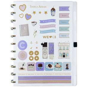 Grande: Capa e contracapa rígidas, 01 folha de adesivos exclusivos, 01 bolsa plástica, 01 folha de instrução de uso e manuseio, com refis e acessórios da marca disponíveis no verso, 01 folha de identificação com calendário no verso, 01 folha de identificação com calendário no verso, 01 folha de apresentação Isabela Akkari, 01 folha de receita Isabela Akkari, 01 folha para anotação de receita, 04 divisórias clean (02 transparentes e 02 branco gelo) com abas para identificação localizadas nas laterais, 80 folhas offset 90g (60 folhas pautadas e 20 folhas lisas brancas para impressão), 01 suporte com elástico para 01 caneta ou 01 lápis e discos M + elástico.