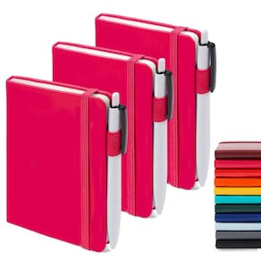 Pacote com 3 cadernos de bolso com 3 canetas pretas, mini caderno pequeno e fofo Feela A6, capa dura a granel, bloco de notas universitário com porta-canetas para material escolar de escritório, 3,5” x 5,5”, Berry