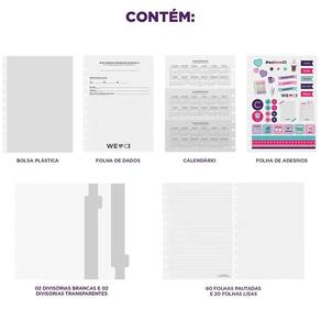 Acompanha bolsa plástica, folha de adesivos, divisórias com abas e suporte elástico para caneta.