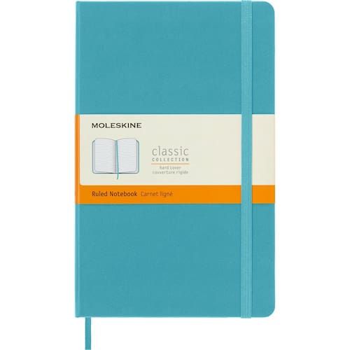 Moleskine Caderno clássico, capa dura, grande (12,7 cm x 21 cm), pautado/forrado, azul recife, 240 páginas - Caderno clássico Moleskine: os cadernos clássicos da Moleskine são cadernos perfeitos para escrever diários, um diário ou tomar notas em aulas ou reuniões da faculdade. Os cadernos Moleskine são amados por viajantes e jornalistas por seu design fino. - Capa durável e fecho elástico: mantenha projetos de escrita e notas em seu caderno Moleskine com uma faixa de fecho elástico e pastas de armazenamento internas. Capa Moleskine clássica semelhante a couro e páginas grossas de papel marfim são perfeitas para escrever com canetas-tinteiro. - Cadernos de qualidade para presente: agendas, diários e cadernos Moleskine vêm em capa dura ou capa mole e cores como preto, vermelho, azul, verde e marrom. A encadernação e a capa têm um acabamento durável, projetadas para diário, escrita e esboço. - Páginas de qualidade de luxo: as páginas grossas de papel marfim da Moleskine em um caderno Moleskine de capa dura, caderno Moleskine de capa mole, diário cahier ou volant ou agenda Moleskine são perfeitamente texturizadas para escrever com uma caneta esferográfica, caneta-tinteiro ou lápis. - MOLESKINE Qualidade: somos dedicados à cultura, viagens, memória, imaginação e identidade pessoal — tanto física quanto digital. Trazemos esse compromisso para nossos cadernos, bolsas, aplicativos, canetas inteligentes e notebooks.