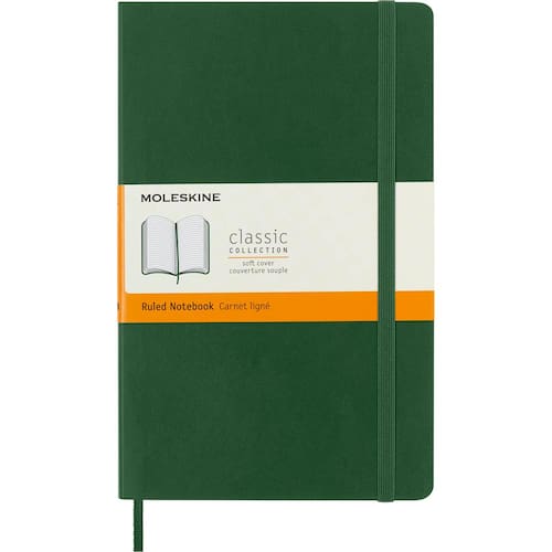 Moleskine Caderno clássico, capa macia, grande (12,7 cm x 21 cm), pautado/forrado, verde murta, 192 páginas - Caderno clássico Moleskine: os cadernos clássicos da Moleskine são cadernos perfeitos para escrever diários, um diário ou tomar notas em aulas ou reuniões da faculdade. Os cadernos Moleskine são amados por viajantes e jornalistas por seu design fino. - Capa durável e fecho elástico: mantenha projetos de escrita e notas em seu caderno Moleskine com uma faixa de fecho elástico e pastas de armazenamento internas. Capa Moleskine clássica semelhante a couro e páginas grossas de papel marfim são perfeitas para escrever com canetas-tinteiro. - Cadernos de qualidade para presente: agendas, diários e cadernos Moleskine vêm em capa dura ou capa mole e cores como preto, vermelho, azul, verde e marrom. A encadernação e a capa têm um acabamento durável, projetadas para diário, escrita e esboço. - Páginas de qualidade de luxo: as páginas grossas de papel marfim da Moleskine em um caderno Moleskine de capa dura, caderno Moleskine de capa mole, diário cahier ou volant ou agenda Moleskine são perfeitamente texturizadas para escrever com uma caneta esferográfica, caneta-tinteiro ou lápis. - MOLESKINE Qualidade: somos dedicados à cultura, viagens, memória, imaginação e identidade pessoal — tanto física quanto digital. Trazemos esse compromisso para nossos cadernos, bolsas, aplicativos, canetas inteligentes e notebooks.