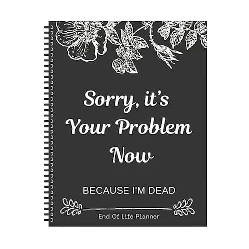 1 - ?O livro de exercícios do organizador do planejador de fim de vida?A pasta de trabalho organizadora do planejador de fim de vida é uma ferramenta bem-humorada de planejamento de fim de vida intitulada "Desculpe, o problema é seu agora porque eu estou morto. Esta edição engraçada do planejador de fim de vida ajuda você a organizar seus arranjos finais com um toque alegre - ?Organização abrangente?Este melhor organizador de fim de vida inclui seções para todas as suas informações importantes, tornando mais fácil para seus entes queridos encontrarem tudo o que precisam, incluindo arranjos financeiros, planos, distribuição de herança, etc., para que seus entes queridos possam obter ajuda quando ocorrerem eventos infelizes - ?Enchimento guiado?O fichário organizador de fim de vida útil é projetado para facilitar o uso, com seções claras e instruções para guiá-lo durante o processo. Este organizador de livros de vida é perfeito para quem quer colocar seus negócios em ordem - ?Durável e elegante?Com um design de caderno de capa dura, este livro de planejamento de fim de vida é durável e elegante. Os blocos de notas engraçados e os elementos engraçados dos cadernos adicionam um toque único, tornando-os uma ferramenta memorável e útil - ?Cuidados de fim de vida e desejos finais?Descreva claramente seus desejos de fim de vida, tomadores de decisão designados e quaisquer solicitações especiais que você tenha, garantindo que seus desejos sejam respeitados e seguidos