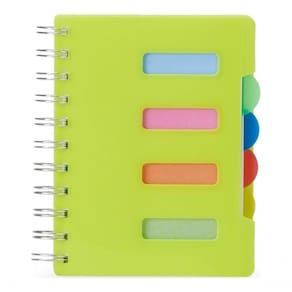 Caderno pequeno com 4 divisórias e abas para identificações, capa plástica com wire-o metálico. Contém aproximadamente 103 folhas marfins e folha inicial com tarjas para organizar e identificar as divisórias.
