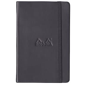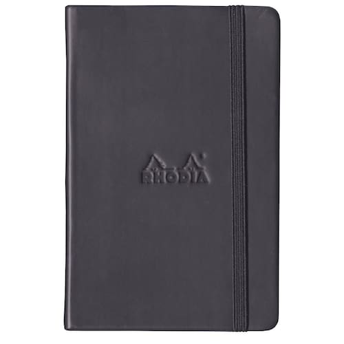 - O caderno web tem uma capa de couro sintético com uma alça elástica