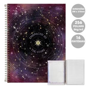 Caderno univ 16mat 256fl magic embraced by the stars tilibra o caderno espiral capa dura colegial 16 matérias magic 256 folhas possui capa dura com a parte interna decorada, folha com adesivos funcionais, folhas pautadas. Ideal para o dia a dia na escola ou na faculdade. Características: - material de alta resistência; - design diferenciado; - espiral 256 folhas pautadas linhas pretas ; - papel 56g/m2 - capa dura; - produto certificado: fsc - medidas: l 200 x a 275mm atenção: a cor do produto pode variar de acordo com o monitor atenção: o fabricante pode alterar a cor de alguma parte do produto sem aviso prévio. Imagem meramente ilustrativa, não acompanha materiais extras.