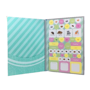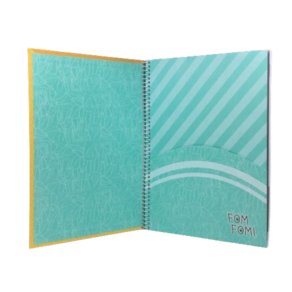 O Caderno Espiral Universitário Fom Fom possui capa dura com a parte interna decorada, bolsa de papel decorada para guardar trabalhos e anotações, folha com adesivos funcionais, folhas pautadas e espiral branco. Ideal para o dia a dia na escola.