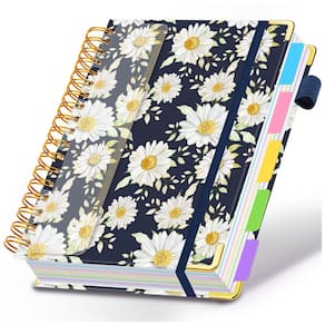 Este caderno universitário espiral HDhuiun em formato 8 x 10 reúne 300 páginas pautadas distribuídas em 5 seções, adequado para anotações em rotinas de estudo, trabalho e organização pessoal. A capa dura floral com estampa de margaridas brancas é resistente ao uso diário e pode ser limpa com facilidade.
