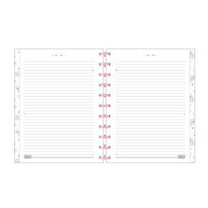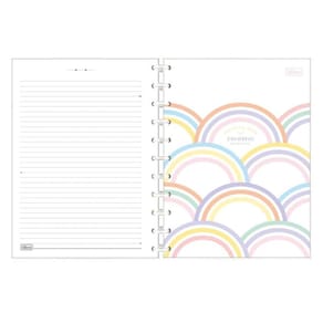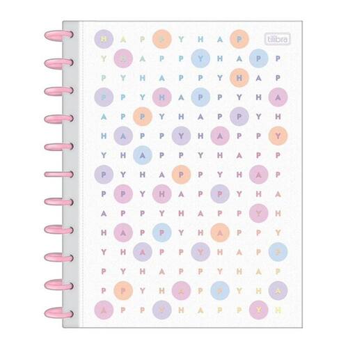 O Caderno Universitário Tilidisco 10 Matérias Happy 160 Folhas possui capa e contracapa flexíveis, com acabamento metalizado, que podem ser utilizadas dos dois lados. O produto tem camada extra de proteção feita por uma sobrecapa plástica, com acabamento metalizado, e uma contracapa plástica. O Tilidisco também conta com índice e separador decorados, bolsa plástica, adesivos, pacote com 11 discos, com 33mm de diâmetro, transparentes com glitter dourado, sendo 1 peça para caso de perda, e folhas pautadas e decoradas, com gramatura de 90 g/m, para facilitar o encaixe dos discos e oferecer mais possibilidades para escrita com diversos tipos de canetas.